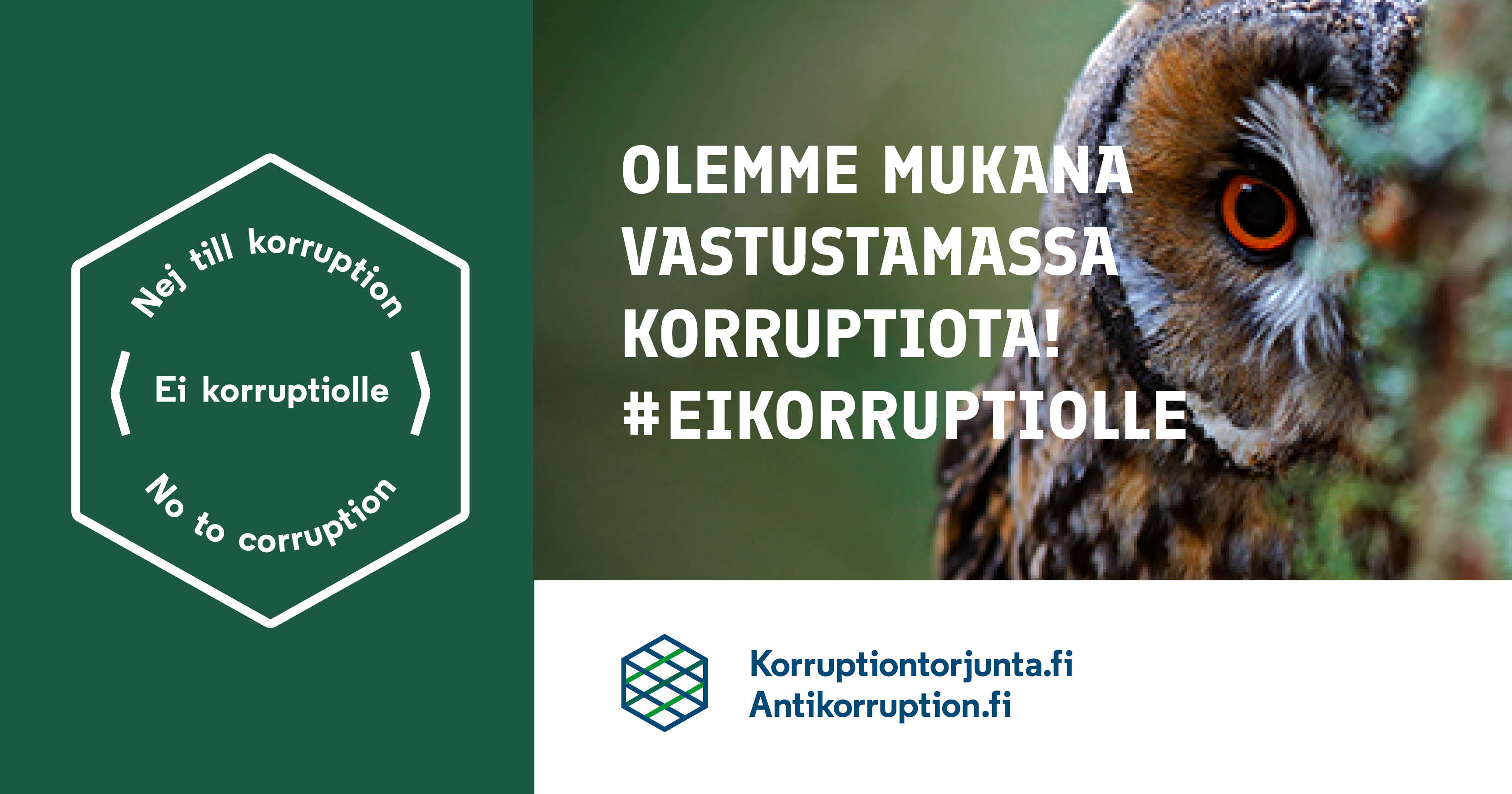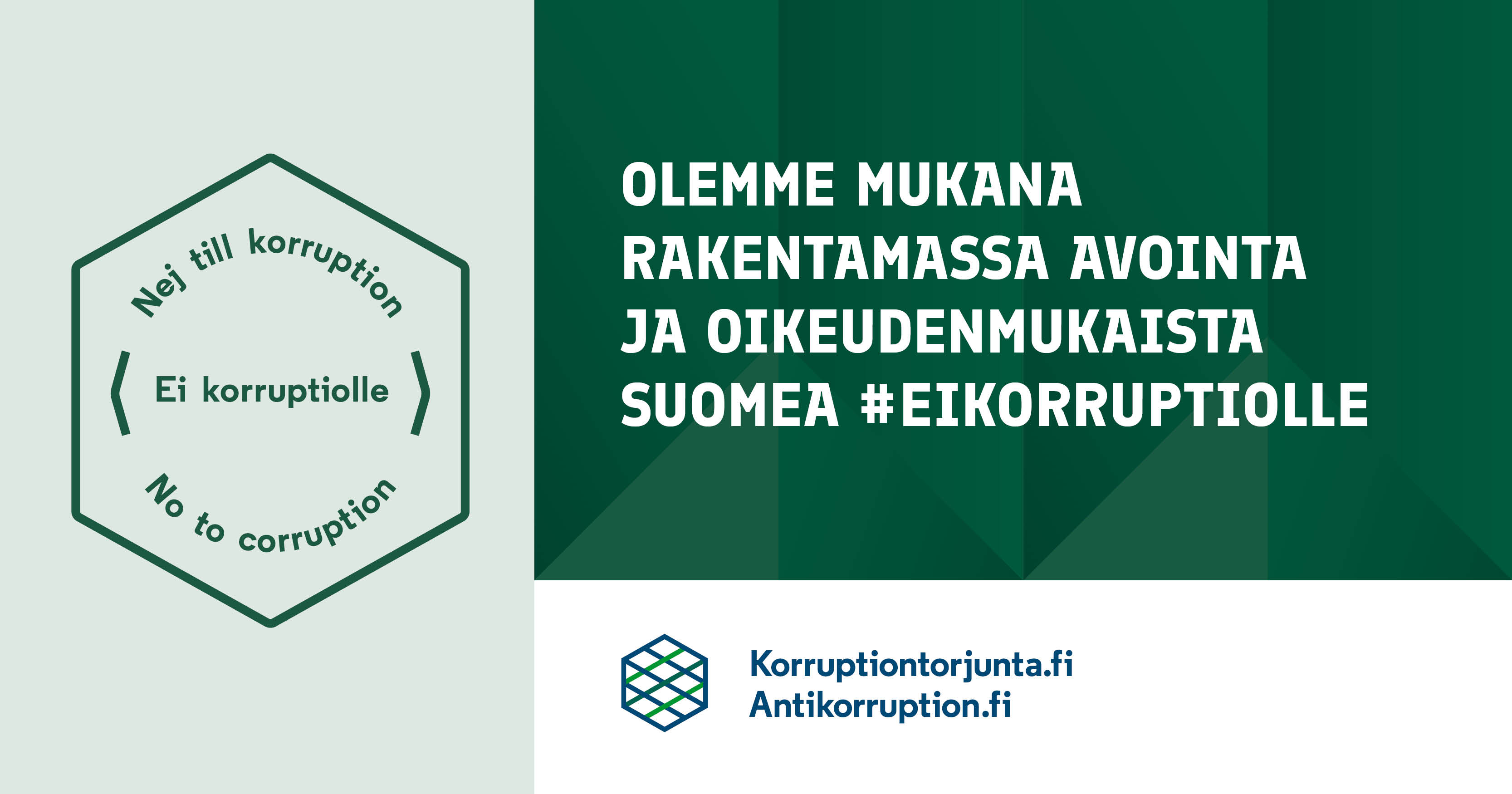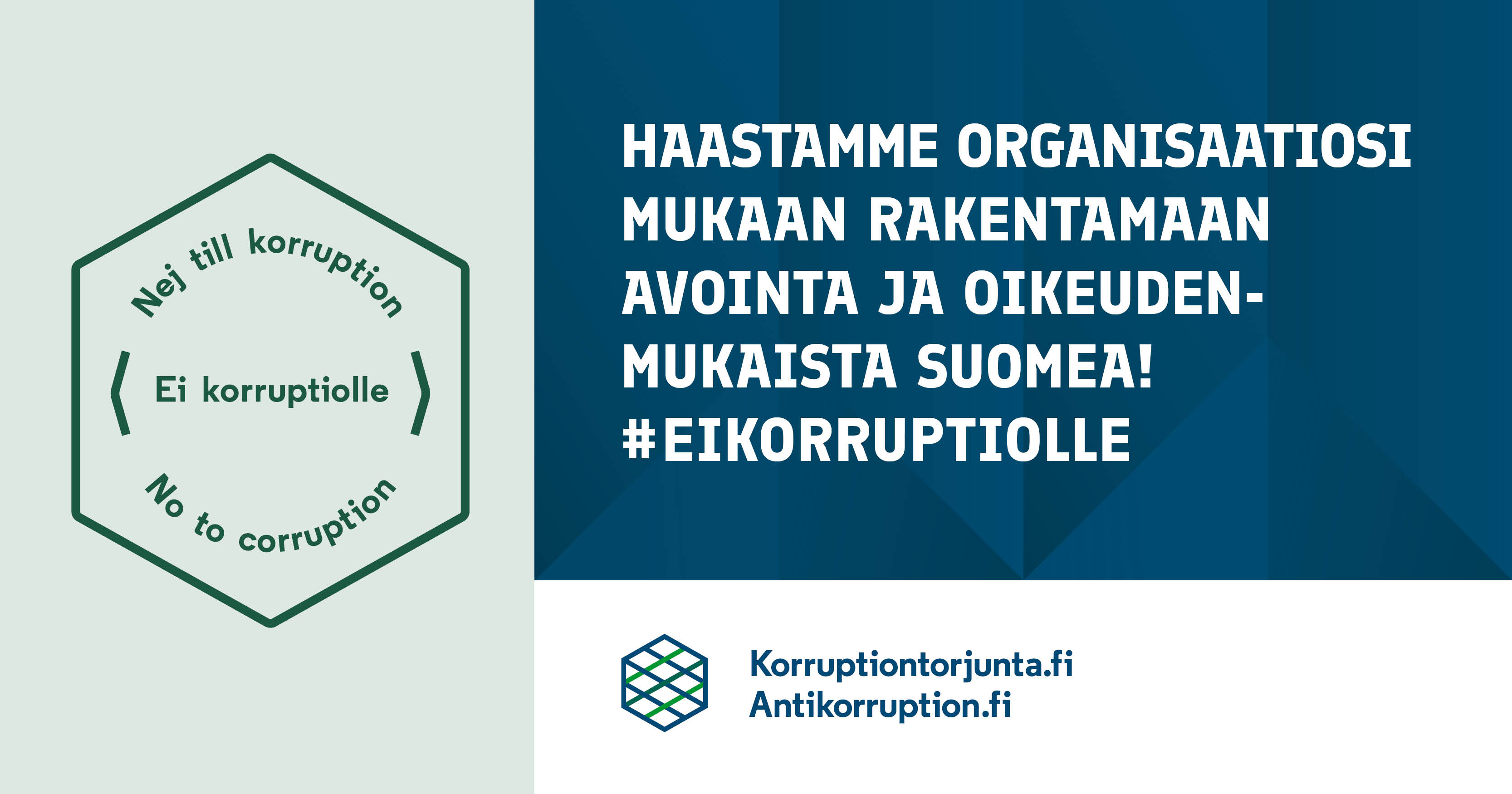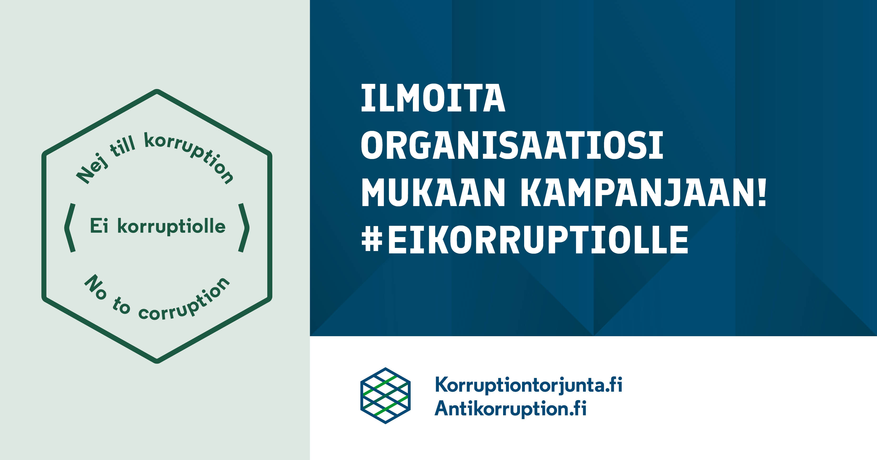 Korruptio on lahjontaa laajempi ongelma. (Organisaation nimi) on sitoutunut vastustamaan korruptiota ja edistämään toiminnassaan avoimuutta ja oikeudenmukaisuutta. Sano sinäkin #eikorruptiolle! Lisätietoa kampanjasta: www.korruptiontorjunta.fi/eikorruptiolle