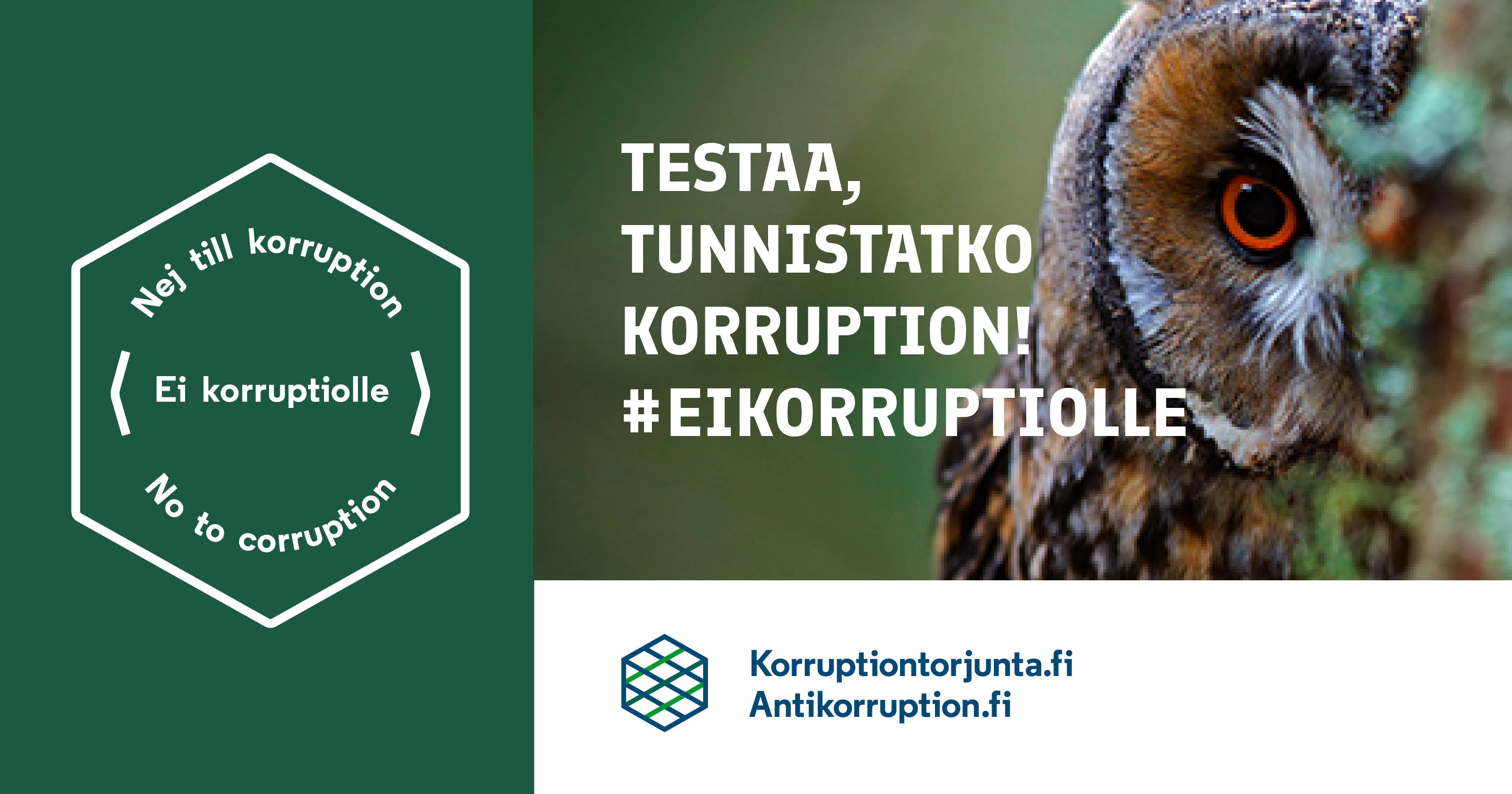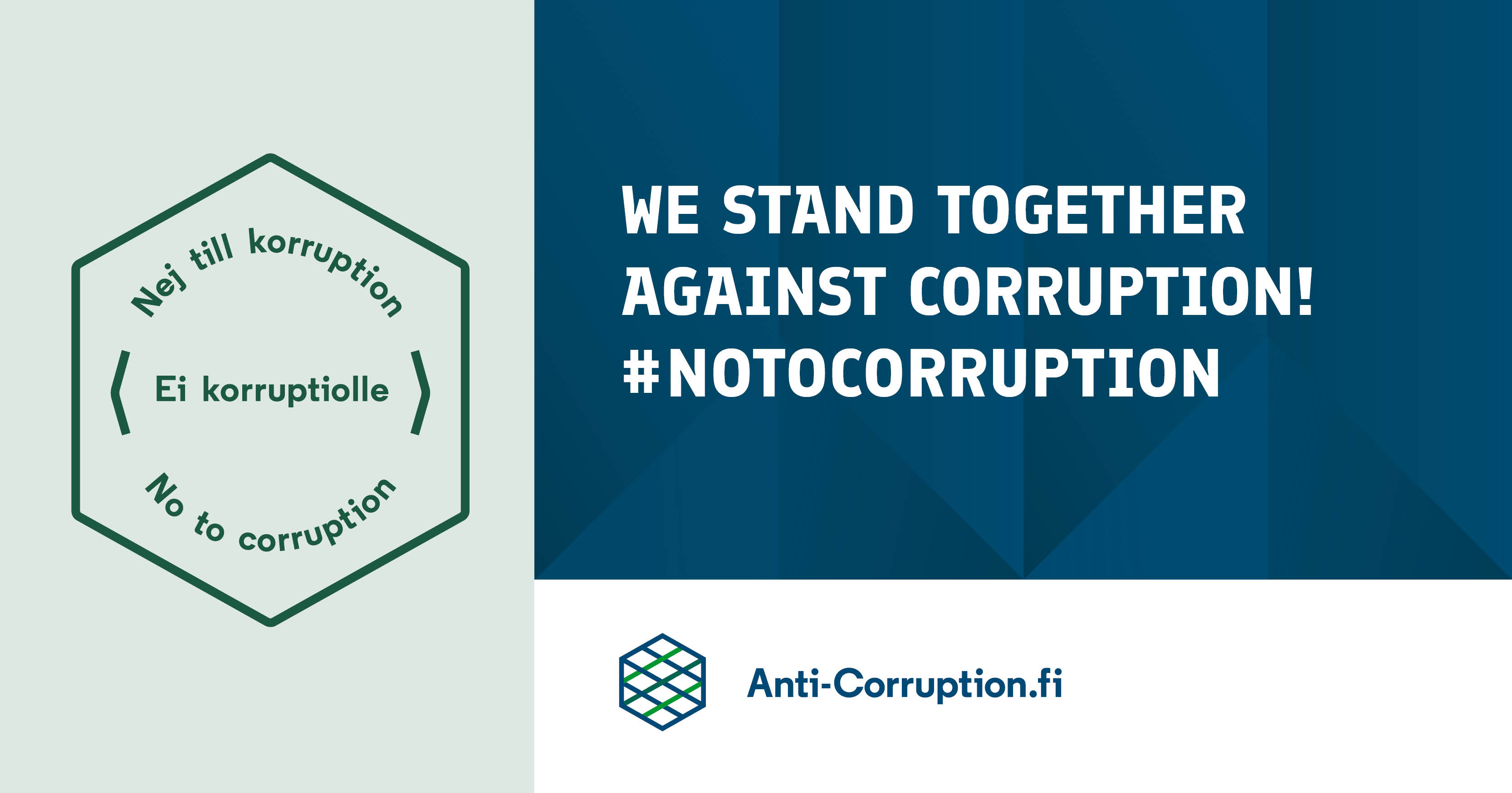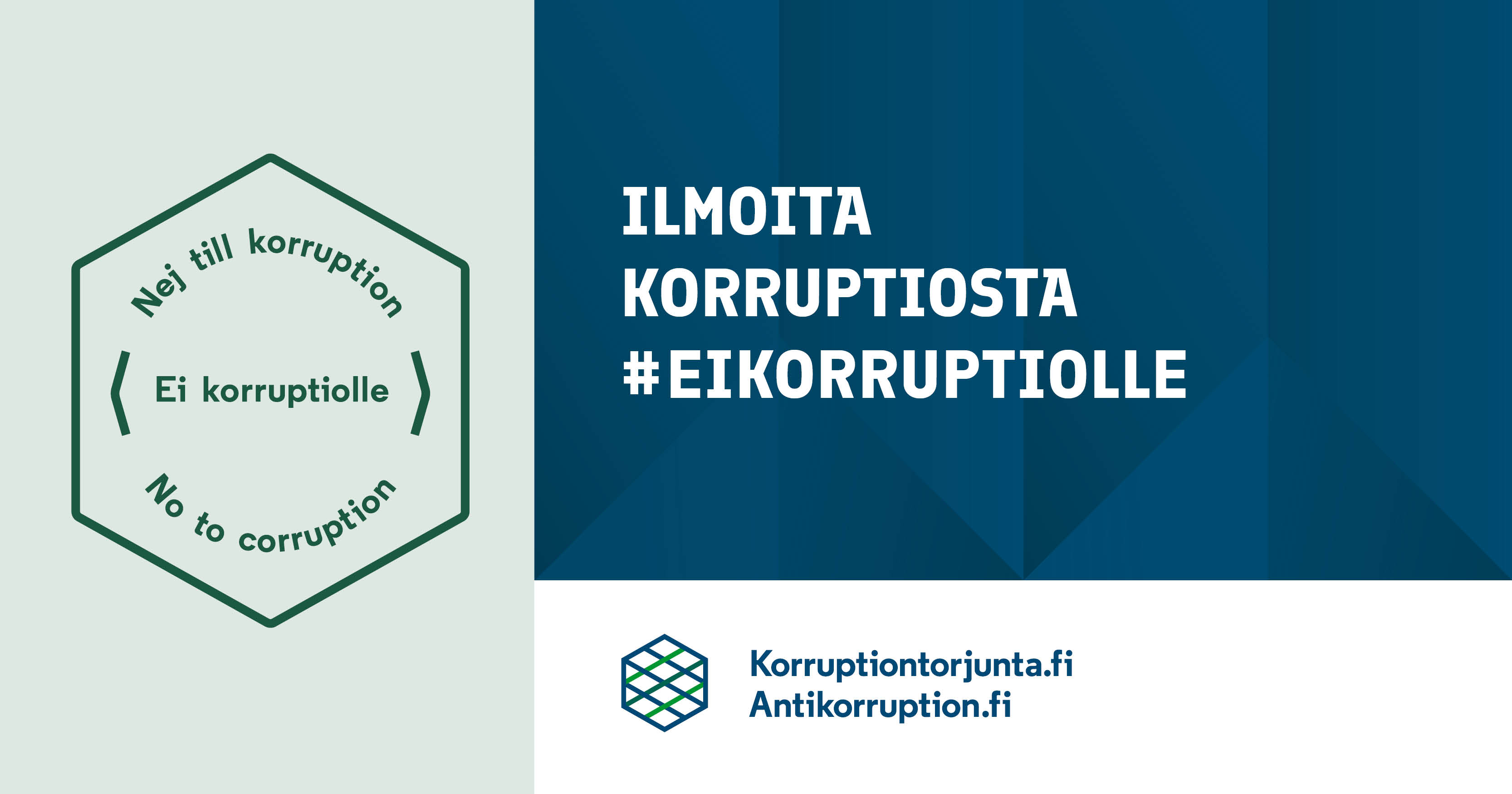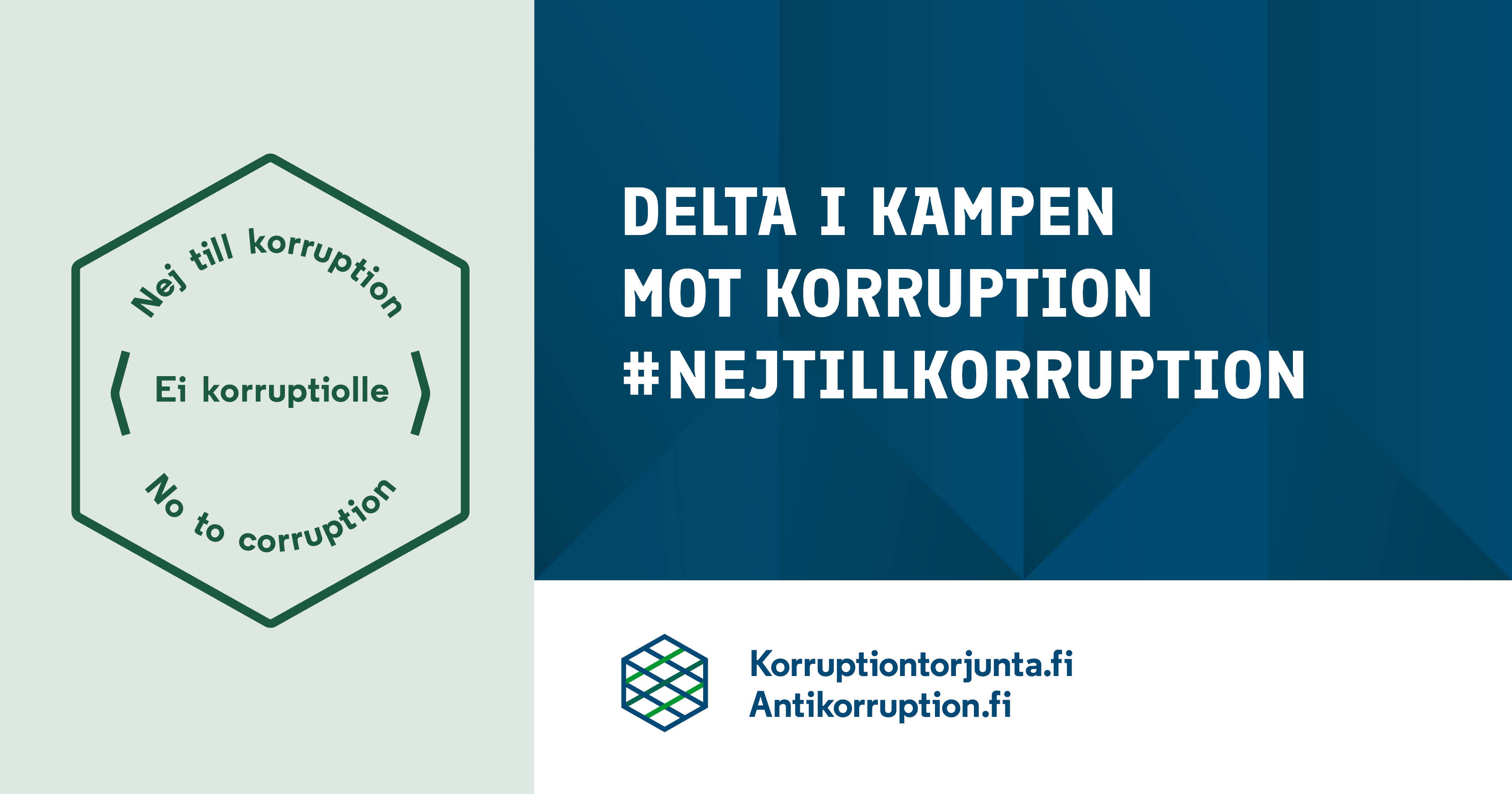 Korruptio on lahjontaa laajempi ongelma. (Organisaation nimi) on sitoutunut vastustamaan korruptiota ja edistämään toiminnassaan avoimuutta ja oikeudenmukaisuutta. Sano sinäkin #eikorruptiolle! Lisätietoa kampanjasta: www.korruptiontorjunta.fi/eikorruptiolle