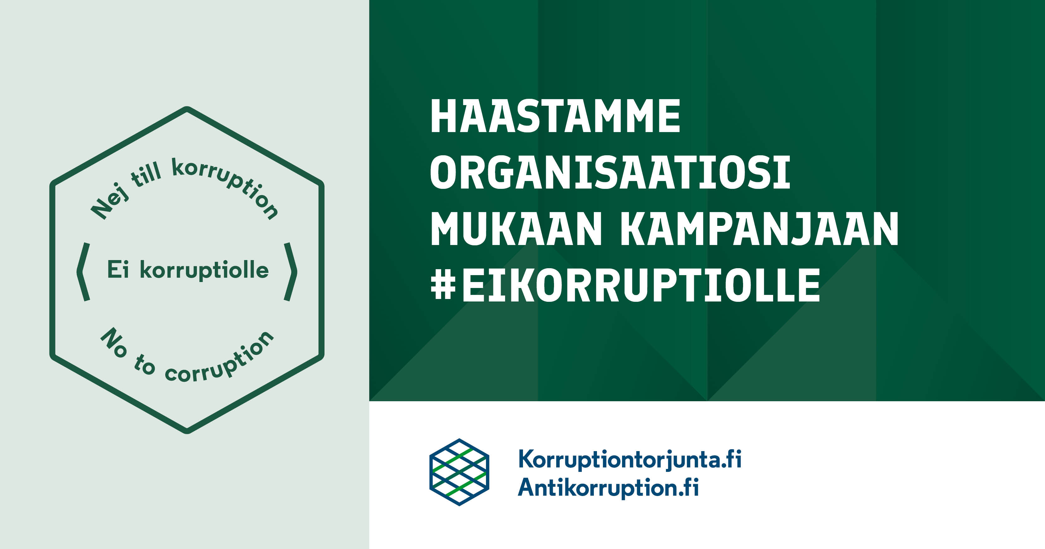 Haastamme (haastettava organisaatio, mielellään tägättynä) mukaan #eikorruptiolle-kampanjaan. Tule mukaan rakentamaan Suomea, jossa korruptio ei menesty! Lisätietoa kampanjasta: www.korruptiontorjunta.fi/eikorruptiolle