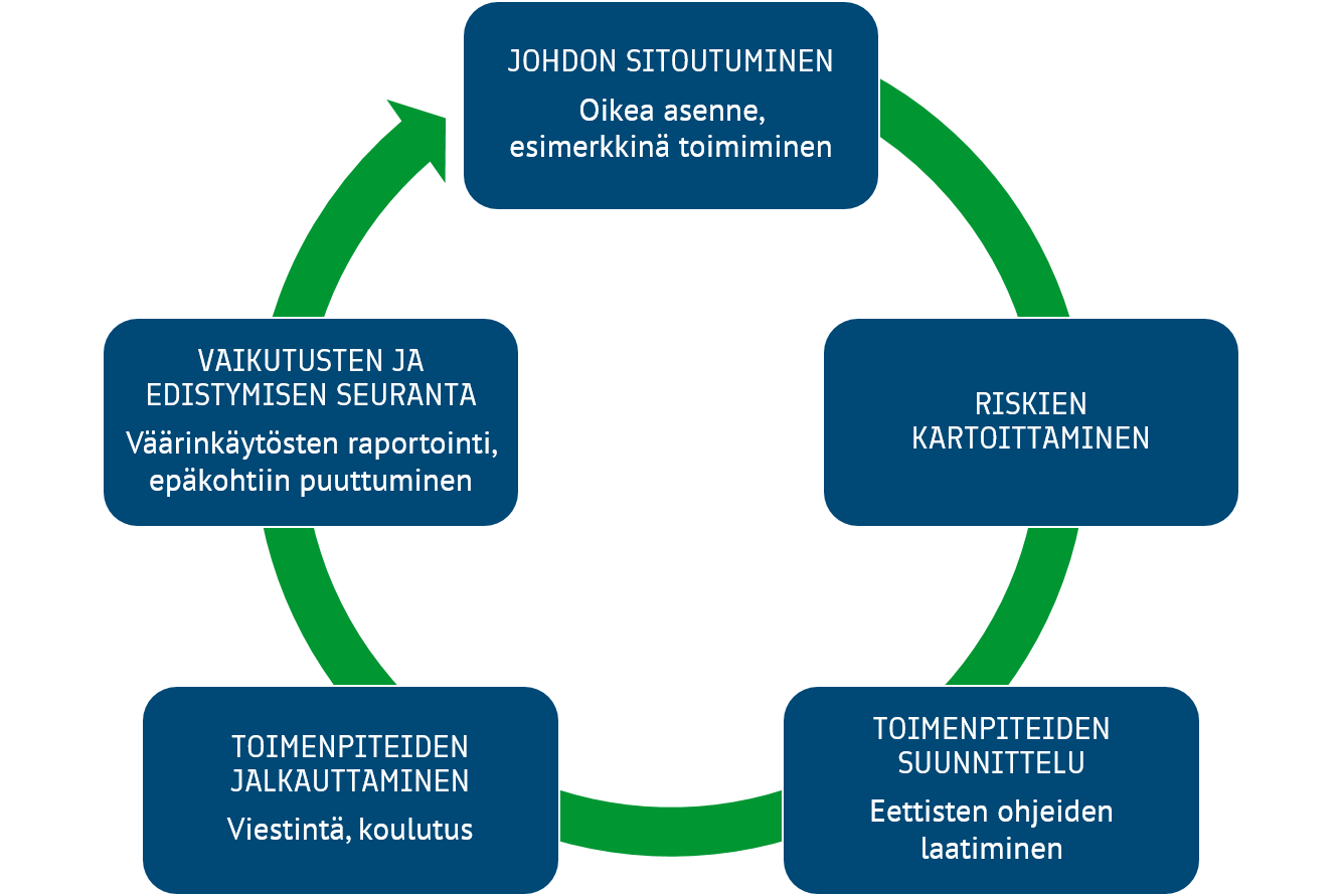 Kaikilla yrityksillä tulisi olla eettiset ohjeet, jotka auttavat ratkaisemaan epäselviä tilanteita. On tärkeää, että nimenomaan yrityksen johto tekee päätöksen eettisten ohjeiden laatimisesta. Johdon täytyy sitoutua korruptiontorjuntaan, koska sillä on tärkeä suunnannäyttäjän rooli.
